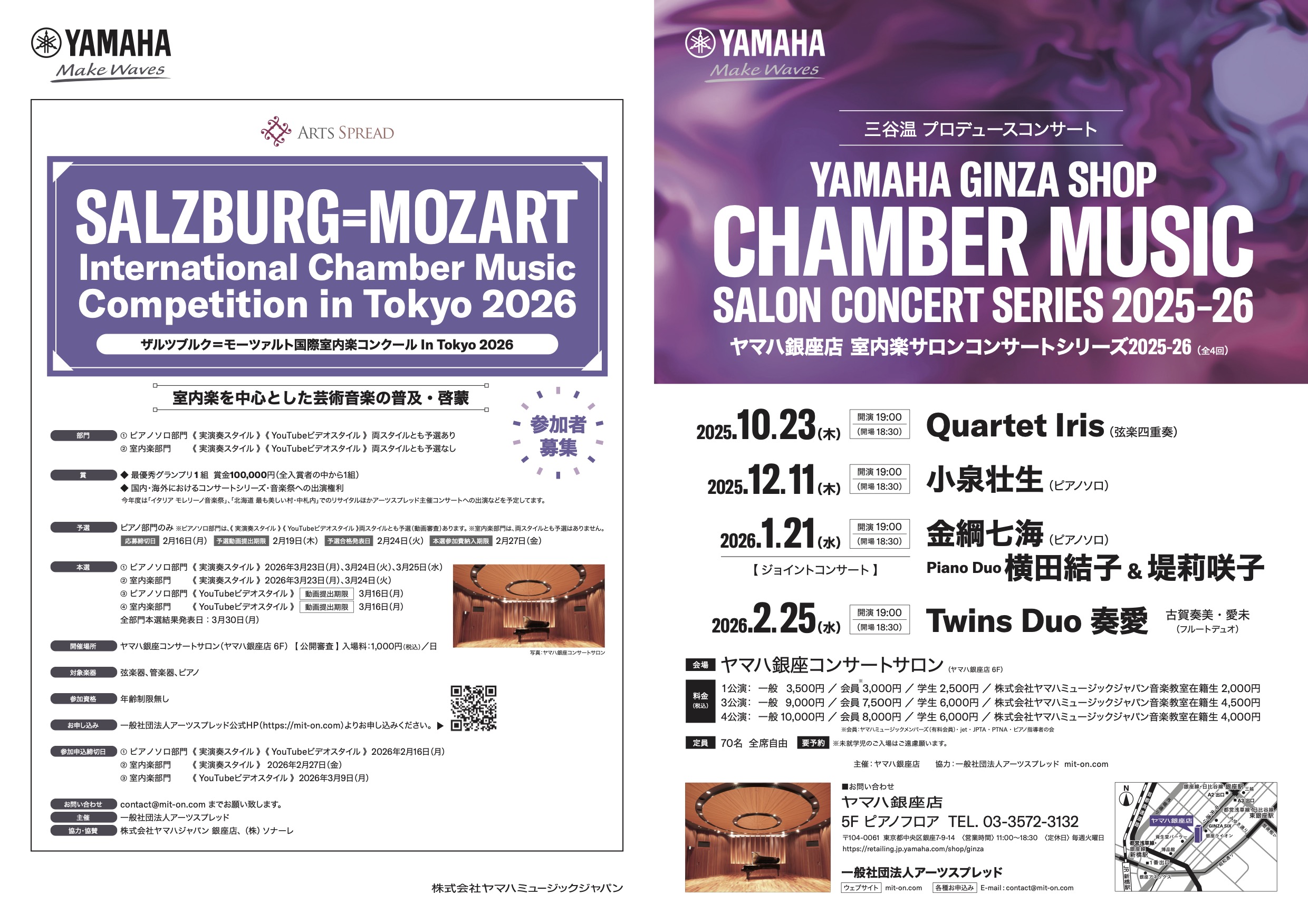 【協力事業】ヤマハサロンコンサート2025-26開催 コンサート 2025.10.10 〜 三谷 温プロデュースコンサート 〜 今年度も、『ヤマハ銀座 室内楽サロンコンサートシリーズ2025-26(全4回)』が開催されます。 『ご予約受付開始はヤマハ銀座店HPサロン公演情報にてご確認ください』